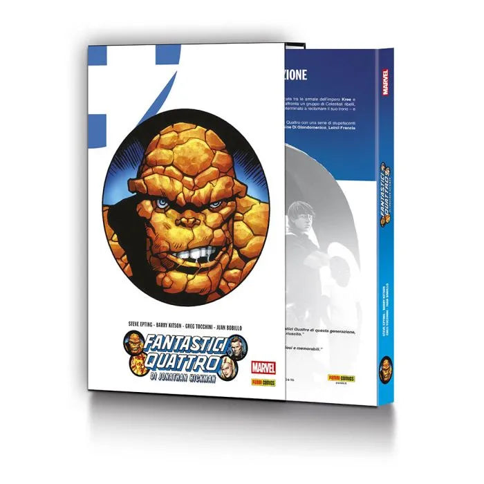 Continua l’epocale run di Jonathan Hickman in formato gigante! La Torcia Umana è tornata e la Prima famiglia Marvel si riunisce giusto in tempo per restare bloccata tra l'impero Kree e la terrificante Onda Annihilation! La Guerra delle Quattro Città si intensifica con il ritorno di Freccia Nera, determinato a reclamare il suo trono, e il conflitto si espande fino a coinvolgere l'intero Universo Marvel! E mentre la battaglia tra il Consiglio dei Reed e la Fondazione Futuro si estende attraverso il Ponte e si riversa nel nostro mondo, Galactus affronta un gruppo di Celestiali ribelli!